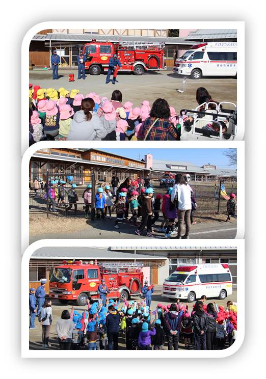 今日は、深谷市消防本部(岡部分署)の協力をいただいて、総合訓練を行いました。初期消火・通報訓練・避難訓練・消火器による消火訓練等を、園児・職員が参加して行いました。岡部分署のみなさんありがとうございました。