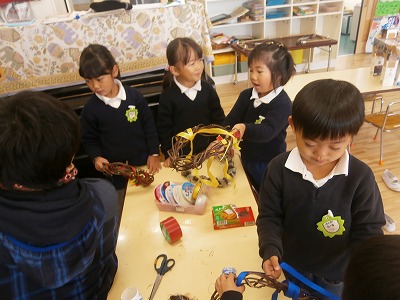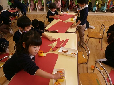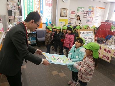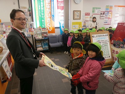 さくら組は、勤労感謝の日にちなんで、稲荷町郵便局へ、施設訪問を行いました。みんなで作ったちぎり絵のプレゼントを渡し、「いつもお仕事ありがとう」と、感謝の気持ちを持って、あいさつをしてきました。お土産をもらい、笑顔で帰ってくることができました。