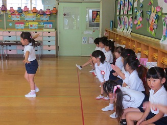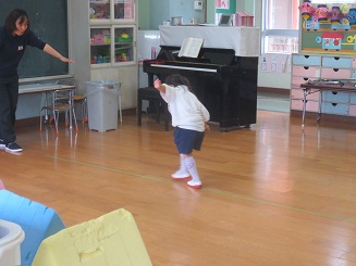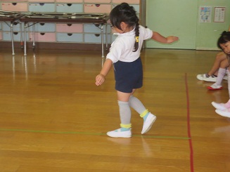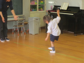 おっとっとと つなわたりー ビニルテープの線の上を落ちないようにバランスを取ってわたります。