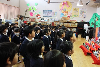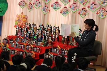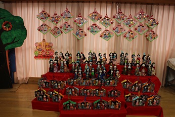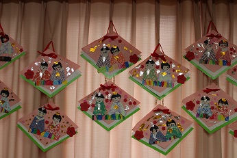 3月です。お友達がしか組に一人増えて、おかべ幼稚園は74人になりました。今日は、桃の節句、ひな祭り行事を行いました。みんなの作品が小ホールに飾られて、にぎやかです。ひな人形がお話をしているように見えるのです。表情も豊かで、寄り添っているようなひな人形には心が和みます。先生から、絵本の読み聞かせをしてもらって、ひな祭りの歌を歌って、ひな祭りを祝いました。部屋では、園児たちのためにプレゼントされたカルピスをいただき、みんなでひなあられを食べました。今日は給食もひな祭メニューです。作った作品を飾って、残ったひなあられをお家でみんなで食べる、楽しいお話に花を咲かせながら、そんな幸せなひと時が訪れますように・・・。
