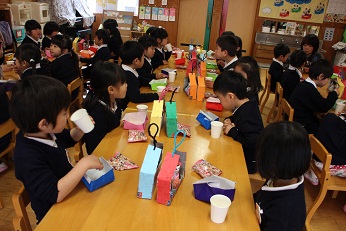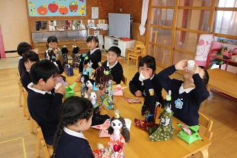3歳児は平面で、そして4歳児は立体で、ひな飾りを作りました。5歳児は、瓶やペットボトルを使ったひな人形づくりに挑戦しました。