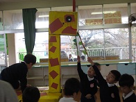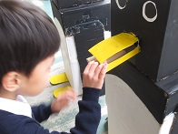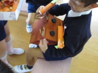 年長さんになると大きな動物作ります。ペンギンは魚を食べる口があったり