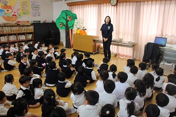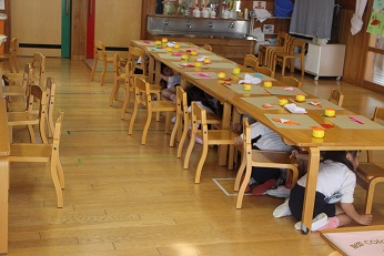 4月17日(水)は、今年度初めての避難訓練を行いました。3歳児にとっては初めての体験ですが、お部屋で担任の先生から避難についてお話を聞いて、「地震が起きたら、どうしたらいいのだろう」と考えを発表できる子もいました。音源を聞いて、みんな上手に机の下にもぐって、お約束通り脚をしっかりとつかんでいました。