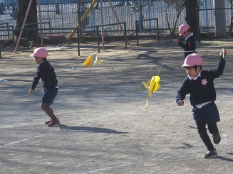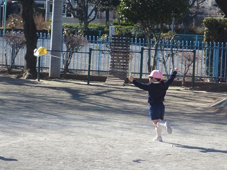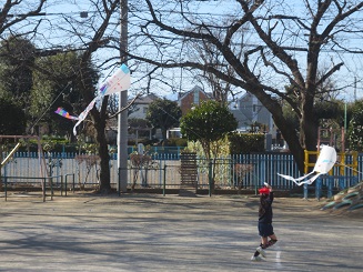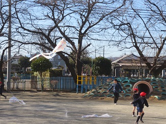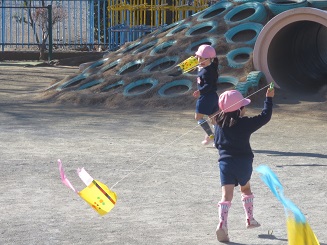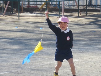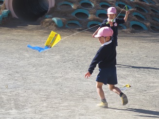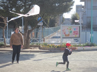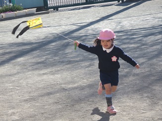 園庭を走り回って、凧が揚がる感触をつかんでいました。