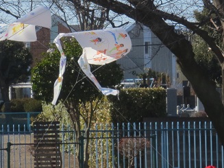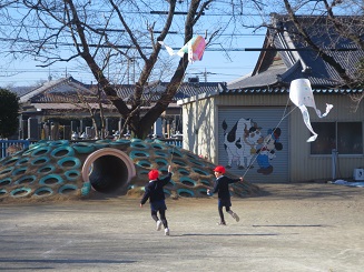 季節は寒中、そして、凧揚げにはちょうどいい風が流れています。園児たちの健やかな成長を願い 凧よ青空に舞いあがれ・・・。