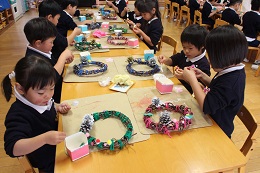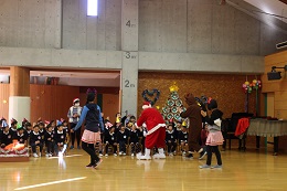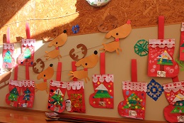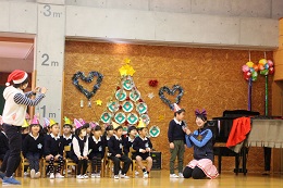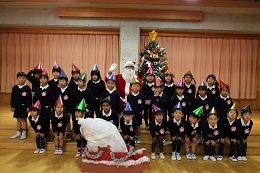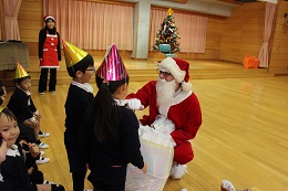12月15日(木)はみらい幼児園おかべとおかべ幼稚園合同の「クリスマス会」でした。今日まで、それぞれの部屋では、サンタさんにプレゼントをいれてもらう赤いブーツ作りや園の畑のいもづるを使って作ったリース作りでクリスマスに向かう気持ちを盛り上げてきました。みんな一人一人が自分なりの工夫をして完成させた作品に、今日はたくさんのプレゼントが入りました。みんなで歌を歌ったり、先生たちの演奏を楽しみました。サンタさんへの質問コーナーの後、サンタさんからクラスごとにプレゼントをもらいました。そして、みんなで記念写真をパチリ!給食もクリスマスメニューです。帰りの袋には、プレゼントのつまった赤いブーツがのぞかせていました。笑顔いっぱいの一日でした。