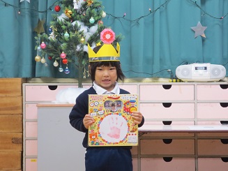 12月の誕生会は1人でした。クリスマス&誕生日とプレゼントが2倍でラッキーの月ですね。将来はお菓子屋さんになり、美味しいお菓子を作ってくれるそうです。おめでとうございます。
