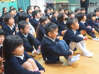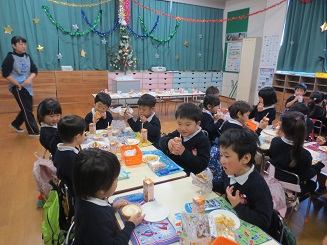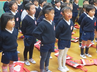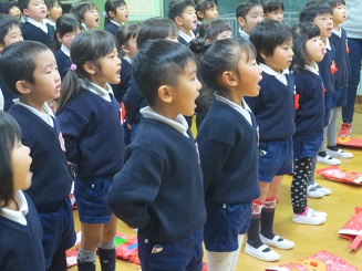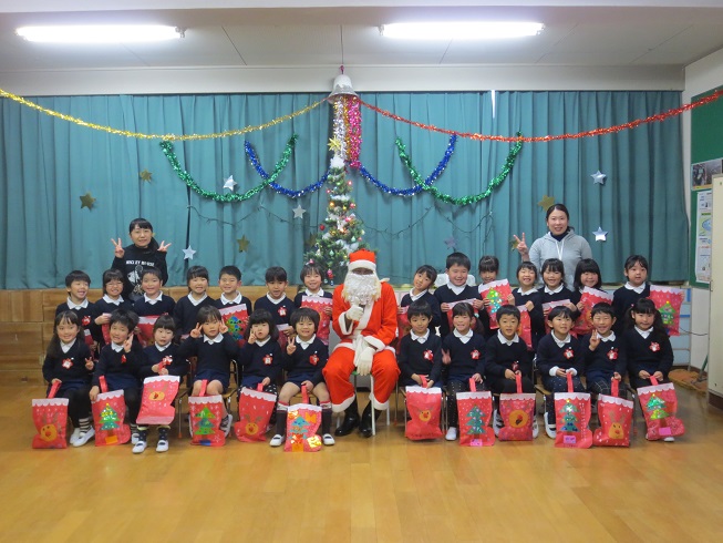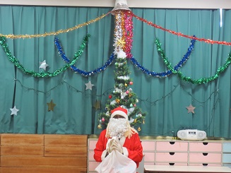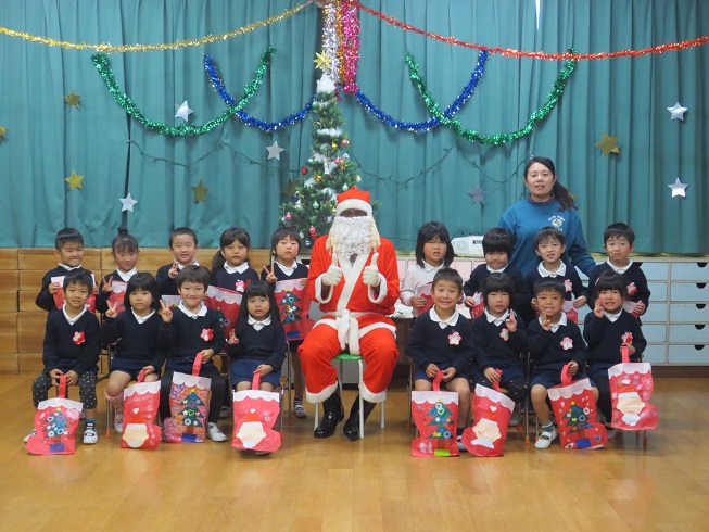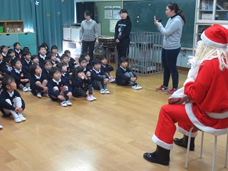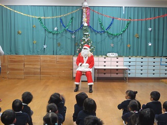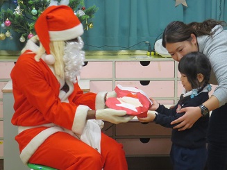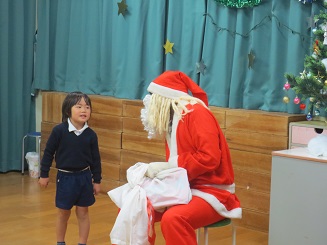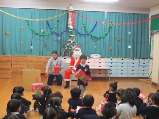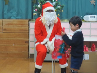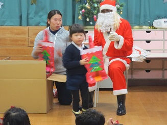リンリンリン・・・鈴の音とともにサンタさんがやってきました。プレゼントをいただきました。「サンキュー」や「ありがとう」と、てれながらもお礼をしっかり言いました。