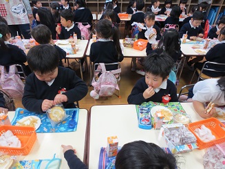 さらに、今日のお楽しみ給食会はハンバーグとロールケーキ、フライドポテト等が出ました。美味しいので会話も弾み、全員でみんなで楽しく食べました。
