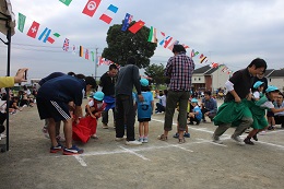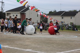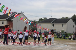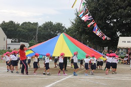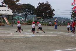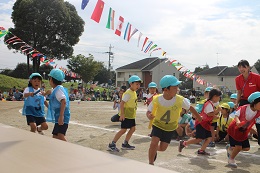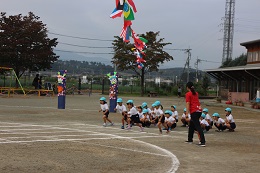 10月8日(土)はよく晴れて、運動会日和となりました。8時30分からスタートした運動会は、かけっこ、親子競技、障害走、リズムと予定通り進みました。保護者綱引き、5歳児のリレーと園庭いっぱいに応援の声が響きました。転んでも泣かず、歯をくいしばってゴールを目指す姿、パラバルーンやよさこいソーラン節の演技種目も真剣に取り組む顔、園児たちに感動をもらいました。また、協力くださった保護者の方やご家族の方々温かい拍手や声援をありがとうございました。PTAの皆様にも、準備から当日の用具係や受付など、大変お世話になりました。おかべ幼稚園みんなの力を結集した運動会となりました。