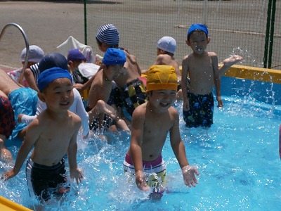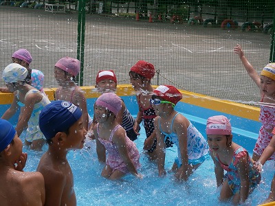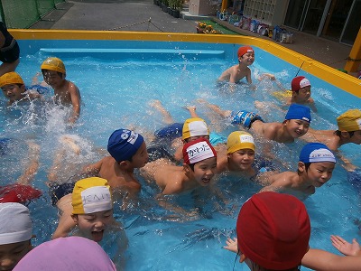 朝から熱くなり、プール遊びにはもってこいの日でした。午前中にうさぎ組が入りました。最初は寒そうにしていた子供たちも、水の温度に慣れると、笑顔いっぱいに楽しんでいました。さくら組は午後入りました。水を怖がらずに挑戦する姿や、やってみようと意欲的な姿が見られました。