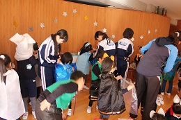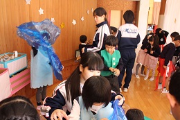 12月7日(水)、8日(木)、9日(金)の3日間で、岡部中学校の2年生が職場体験に来てくれました。生活発表会前で、外遊びの時間も少なく通常の保育の様子を体験してもらうことはできませんでしたが、生活発表会の流れを理解し、覚えて、前日までの準備から当日の着替え、楽器並べなど、本当によくがんばってくれました。最終日の今日、最後の打ち合わせの時間の中で、「幼稚園の時には気づかなかったけれど、先生っていっぱい仕事をしてくれていたんだなあとわかりました。」という感想がありました。幼稚園の時を知っている教務主任、成長した教え子に感動、です。3日間、本当に助かりました。ありがとうございました!