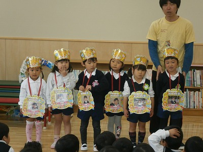 4月生まれは、6人のお友だちです。全員、大きな声で、名前と、大きくなったら何になりたいかを発表してくれました。そのあとは、先生と一緒に、「3匹のチョウチョ」の劇をしました。