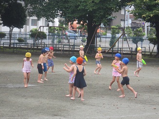 きりん組・さくら組さんたちは、水着に着替えて裸足になって園庭へ