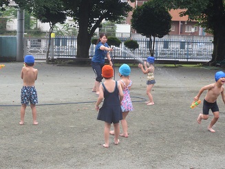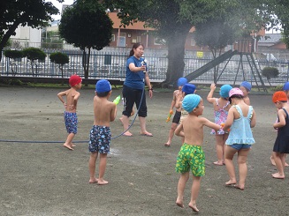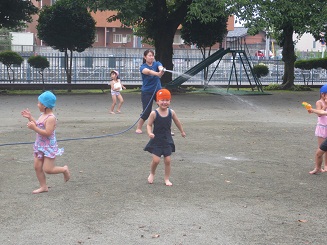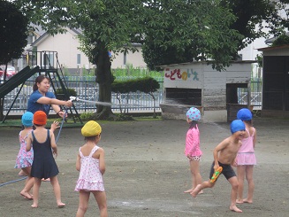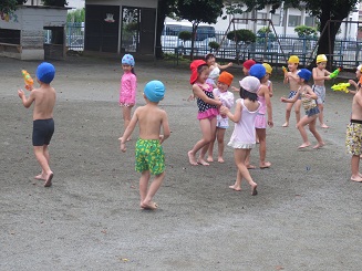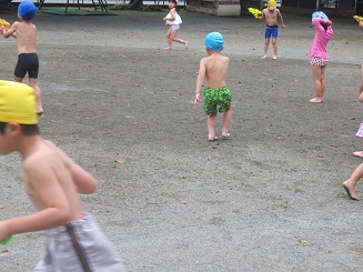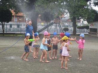 先生のピストルシャワーや霧雨シャワーでみんな「キャーキャー」、どんな時どんな遊びでも楽しさを満喫して遊ぶ園児たち、これが上西幼の楽しさです。 さらに昨日の夏祭りの水鉄砲も使ってピューと、冷たいやら気持ちいいやら、みんなで走り回って楽しんでいました。もうすぐ夏休みですね。きっと梅雨が明け、暑い太陽がみんなを楽しませてくれるるでしょう。みんなを逞しくしてくれるでしょう。