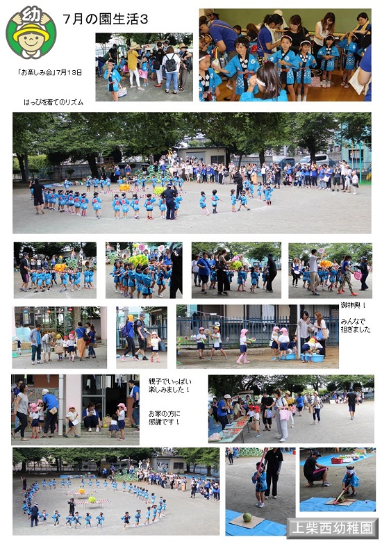 夏休みも残りが少なくなってきました。でも、まだまだ休みは続きますので、それぞれ楽しい夏休みを過ごしています。園として、この夏休みを利用して、一学期の活動を写真にまとめま紹介しています。今日はその最終回です。(お楽しみ会)