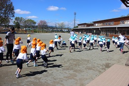 4月18日(火)は体操マラソン開始2日目。今日は、昨日見学していた4歳児(しか組)が参加しました。そして、3歳児はテラスで見学です。明日は、参加できるでしょうか。入園して一週間、お家の人が恋しくて泣いていた園児たちも、園の様子に目が向き始めました。5歳児(きりん組)は、もう頼もしいお兄さんやお姉さんです。確実に新しい生活になじんでいく園児たちをみると伸びゆくたくましさを感じます。