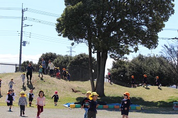 4月15日(月)は、日差しがたっぷりです。今日は、みらい幼児園おかべのお友達と合同の体操マラソンを再開しました。久しぶりの体操に表情は明るく、楽しそうでした。少しずつ緑色に色づき始めた芝山にも、子供たちの元気な山登り走りが見られました。りす組さんからも10人ほどが見学をしました。今日から、体操マラソンスタートです。