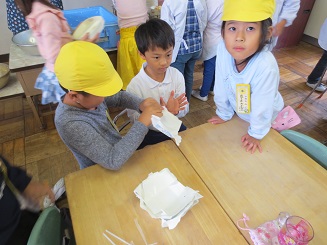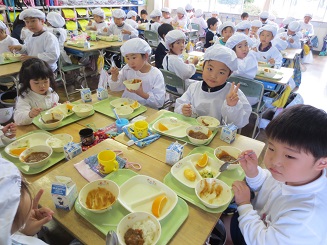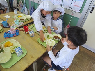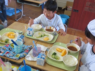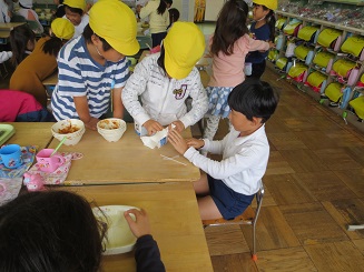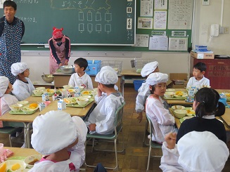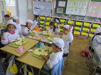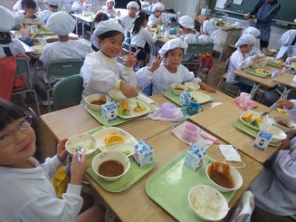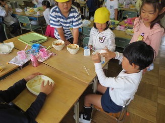 一年生がとっても親切にしてくださいました。 学校の給食のイメージが少しわかりましたね。一年生も、今日ばかりは先輩で、お兄様、お姉様気分ですね。とっても親切やさしいくしてくださいました。ありがとうございました。