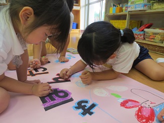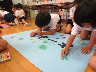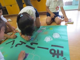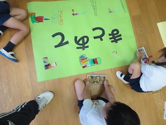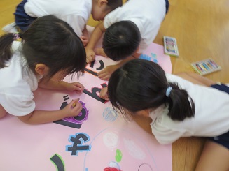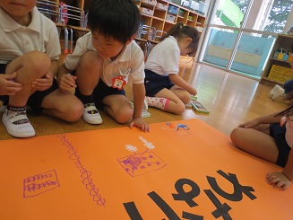プールの入れない今日は、夏祭りのお店の看板作りです。