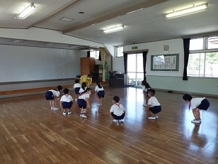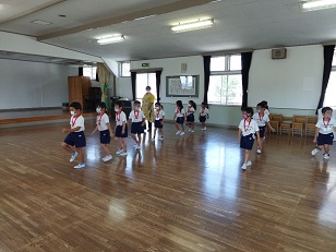 今日の「英語で遊ぼう」は、リズム室でCDの曲に合わせて