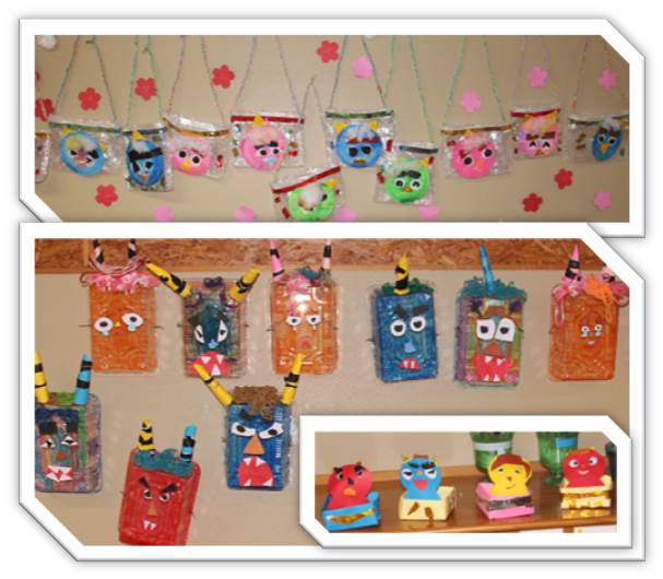 来週の水曜日(2月3日)が節分です。子どもたちは「節分ごっこ」のため、鬼のお面を作ったり豆まき用のマスを作ったりしています。年中児の作った小物入れもよくできています!子どもたちは準備万端です。