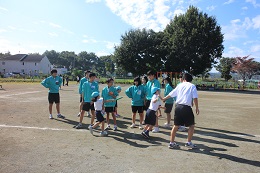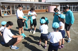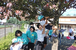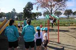 10月18日(火)は、昨日の雨も上がり、気温がぐんぐん上昇しました。岡部中学校の3年生の保育体験も3回目です。3年2組の37人が来園し、5歳児と1時間余りを過ごしてくれました。最後は、いつもと同じ、体操マラソンをいっしょに行いました。「エビカニクス」などの体操を大きな声を出して踊ってくださり、雰囲気が盛り上がりました。自分が楽しむこと、笑顔でいることが自然と園児たちの笑顔を生むこと、気づいてくれたらいいなと思っています。