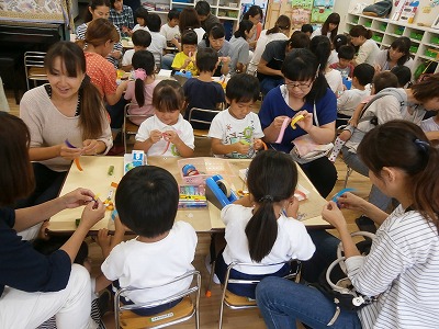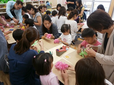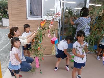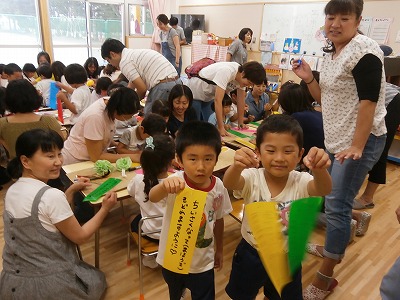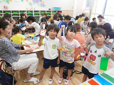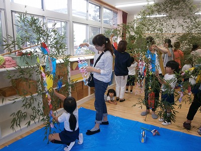 保育参加を行いました。保護者と一緒に七夕飾り作りをして、飾り付けをしました。うさぎ組は、くす玉作りをしました。さくら組は、じゃばら人形を作りました。いろいろな工夫が見られ、それぞれの作品が出来上がりました。短冊に書いた願い事がかなうと良いですね。