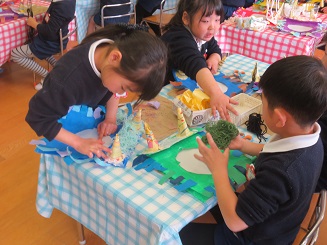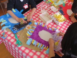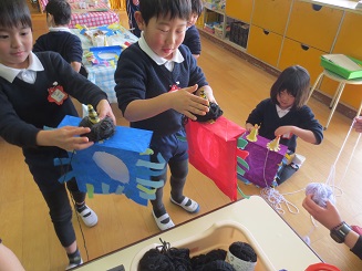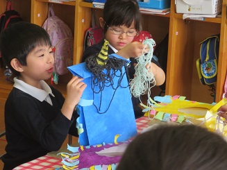 本日、鬼の角と髪の毛をつけいっそう鬼らしくなりました。蒔く豆を入れる箱までもあります。