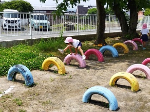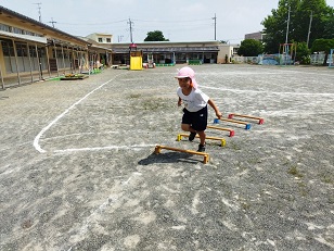 太鼓橋、タイヤ飛び、滑り台、平均台、エス棒、ケンパをして、ゴールです。