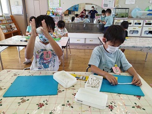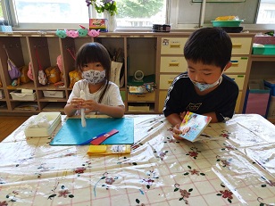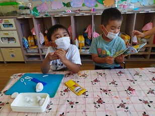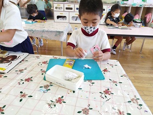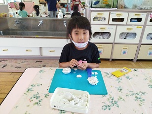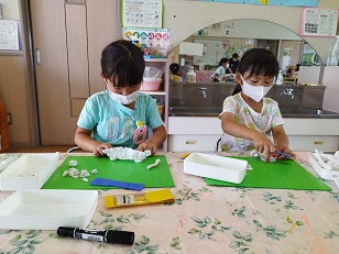 外で思い切り遊んだ後は、室内で七夕飾り作りと粘土遊びなどをしました。