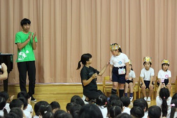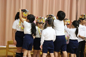 9月25日(火)は9月生まれのお友達の誕生日会でした。みんなで歌を歌ってお祝いをしました。一人一人のインタビューでは、3歳のお友達は好きな食べ物を聞かれて「メロン」としっかりと答えていました。4・5歳児は将来の夢です。アイドルキャラクターは園児たちが大好きなものの一つですが、恐竜博士や動物の飼育員さん、自分の好きなことをきちんと答えられていることが印象的でした。外はあいにくの雨でしたので、みんなで紅白玉入れをしたり、5歳児は昨年の運動会のパラバルーンを披露したり、楽しい時間を過ごしました。
