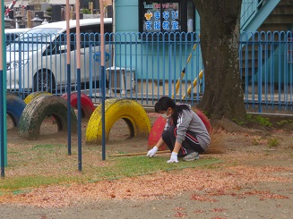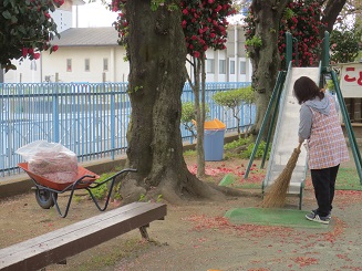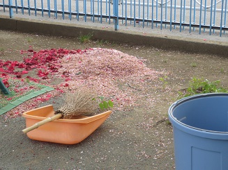 今日は、2度目の桜吹雪を楽しみました。といっても始まる1学期、園児を快く迎えるために園庭の清掃をしました。積もった桜吹雪を集めました。「よい環境はよい人を創る」みんな黙々と必死でしたが、その意気込みを感じました。また、道路まで園の桜が飛び吹きだまりになったものも綺麗にました。腐ると黒くなり排水溝にたまり詰まる原因にもなるからです。完璧とは言えませんが、この地域に園を構える努力の姿勢、これが大事だと思います。