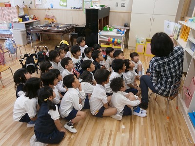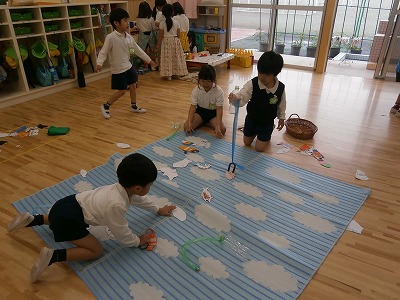 本日の活動の様子です。うさぎ組は、絵本を見ています。さくら組は、さかな釣りを楽しんだり、リズム室にレストランを作り、うさぎ組を招待したりして遊びました。