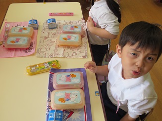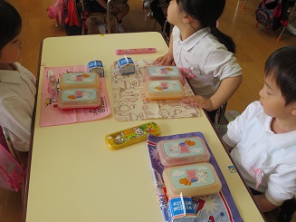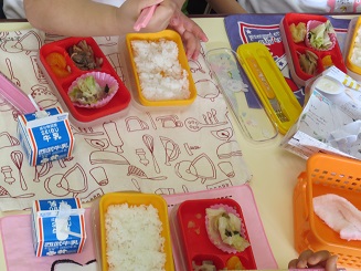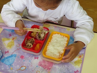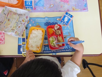 まだまだ、きりん組さんは最初なので、自分での用意はマイ箸だけで、先生が全員分のお弁当(牛乳、ストロー、ご飯とおかず)を順番に配りました。