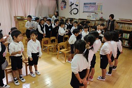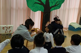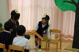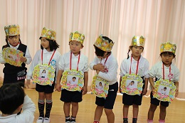 10月25日(火)は素敵なお誕生日メニューの給食の日、6人の10月生まれのお誕生日会でした。「お名前は?」「大きくなったら何になりたいの?」、みんな上手に答えることができました。プリンセス、プリキュアなどから、サッカー選手、アイス屋さんなど夢はいろいろ。しか組の2人のお誕生日を迎えたお友だちが、劇に参加して、「どうぞのイス」を披露しました。温かな良い時間でした。
