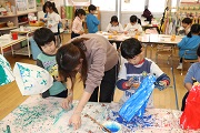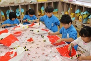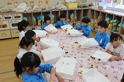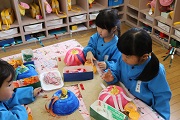来週の節分に向けて、園児たちが鬼のお面づくりをしています。ぱんだ組の園児は、カップを使って、ばら組の園児は、紙袋を使って鬼のお面をつくります。鬼の顔の色は、園児たちが決めましたが、断然、赤鬼が多いようです。この後、更に顔を工夫しながら完成させます。1学期に比べるとみんな物づくりがうまくなってきていますね。