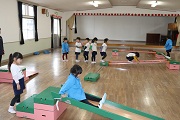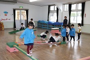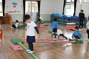 お面づくりの後は、リズム室で巧技台を使って、バランス感覚を養います。