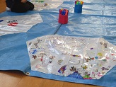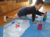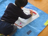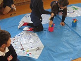 自分だけの凧づくり、さくら組さんは思い思いの絵をマジックで凧の翼に表現しました。色とりどりできれいに仕上がりました。