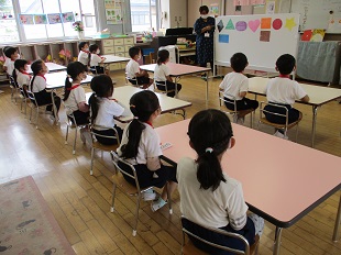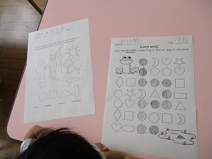 よく話を聞いて、色や形の英語を先生の発音をまねて一生懸命言いました。