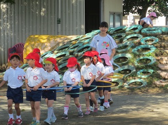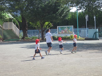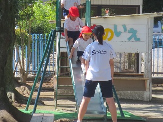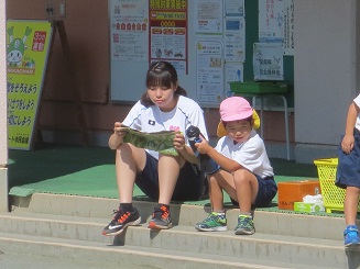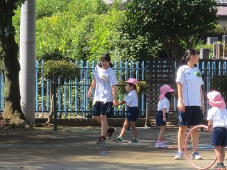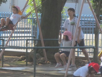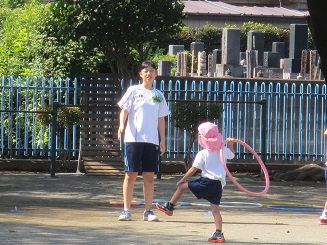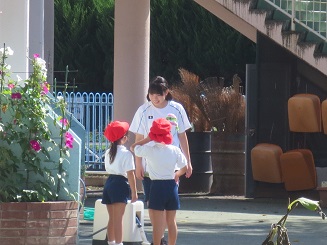 一番園児に近い年頃の高校生ですので、動きがいい、遊びも追いかけっこも、話をするのも、園児との関係を結ぶのが早いです。楽しそう。4人いるので関わりもたくさんしてもらっています。