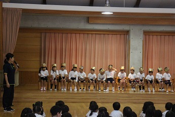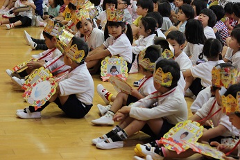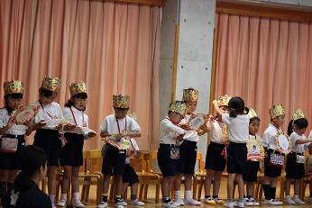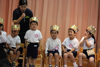 7月9日(火)は7月、8月生まれの誕生会を行いました。おかべ幼稚園15人のお友達が一つ大きくなります。夏の歌を歌って、誕生をお祝いしました。3歳児のりす組さんは6人、好きな食べ物を聞かれてリンゴ、バナナ、イチゴ、みかん、それぞれ自分の考えを答えていました。4・5歳児9人、「大きくなったら何になりたいの」の質問に、プリキュア、消防士、かき氷屋さん、トイストーリーのバズライトイヤー、はやぶさの運転手、画家、ケーキ屋さん、パティシエ、アイドル、みんな一人一人、考えているのですね。先生方からのお祝いは、「何が通ったでしょうゲーム」、おお盛り上がりでした。その後、5歳児のお部屋では、アイスクリーム屋さん、ケーキ屋さん、廃材から作ったアイスクリームやケーキでお店屋さんごっこが始まりました。みんなの想像力におどろきます。