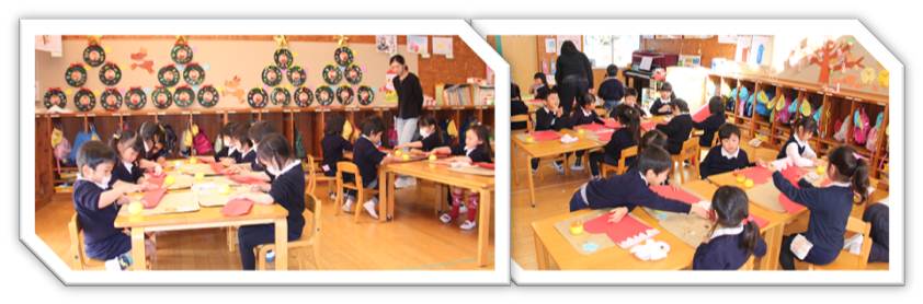 本園でも来週の17日(木)にクリスマス会を行います。今日はその準備として、子どもたちの楽しみの一つであるサンタさんからのプレゼントを入れるブーツを作りました。