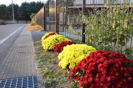 11月7日(月)は、朝は冷え込んだものの風もなく、日差しの暖かな日となりました。園児たちが登園、降園する門のわきに、見事に菊が満開となりました。園児のために、いつもご協力くださる方が大事に畑で育てられた菊の株を植えてくださったものです。黄色と赤色の菊が美しく園児たちを迎えてくれます。お散歩の方が「お花を見るのが楽しみでね」とおっしゃっていました。きっと菊に心なごませて、歩いてくださっていると思います。ありがとうございます。