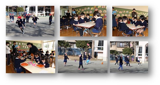 今日は、教育委員会の先生方をお迎えして、子どもたちの様子を見ていただきました。子どもたちは、手つなぎ鬼をしたり、かるた(3つのめばえ)をしたり、凧を作って凧揚げをしました。