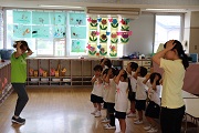いつものように朝の活動・遊びがはじまりました。砂遊び、サーキットトレイニングなどを意欲的に取り組みました。その後、ばら組のみんなは、簡単な竹とんぼづくりをしました。紙とストローをうまく使って作りました。ぱんだ組のみんなは、ふれあい祭りに向けてダンスの練習です。