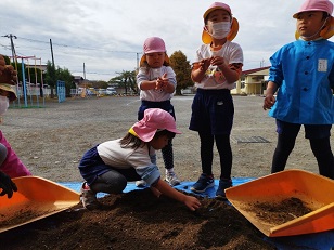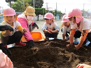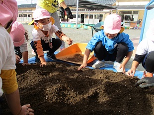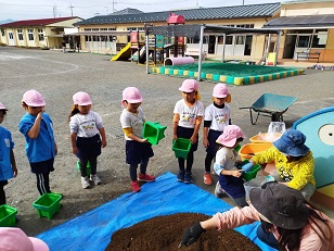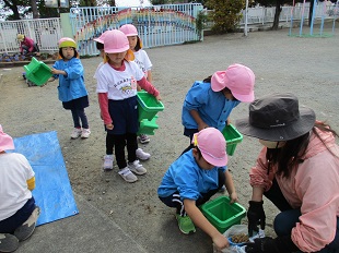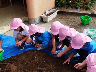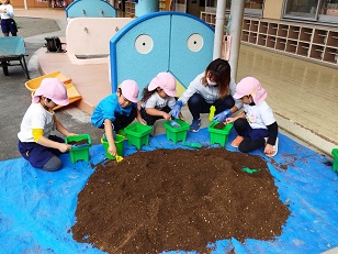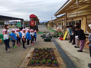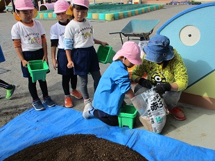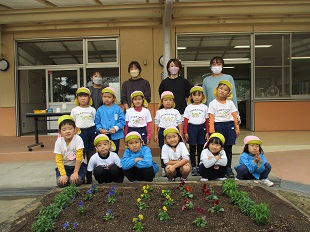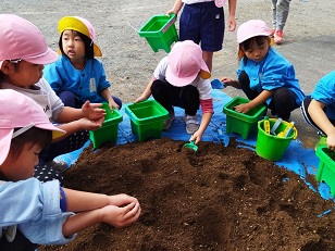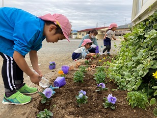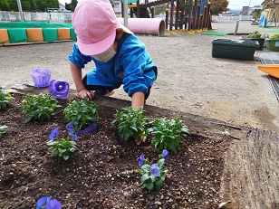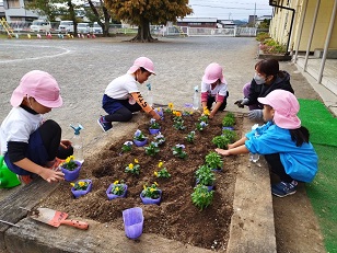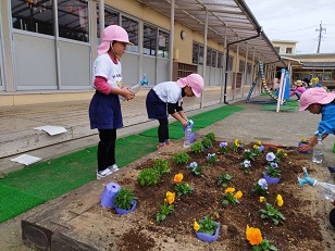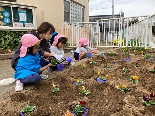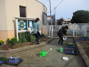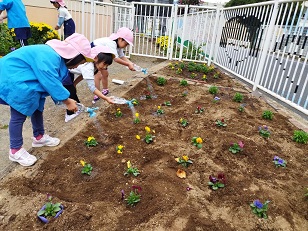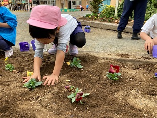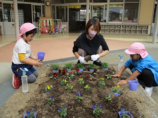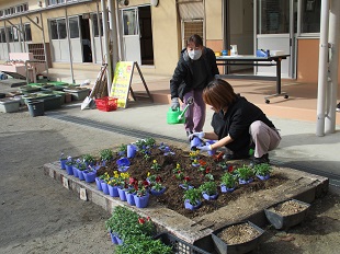お母さん方にお花の先生になっていただき、一緒に植えます。