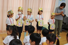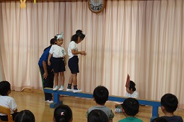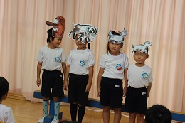 9月27日(火)は9月生まれの園児のお誕生会でした。りすさん1名、しかさん4名のお友だちが9月にひとつ大きくなりました。将来の夢は、アイス屋さん、デザイナー、仮面ライダー、動物のお医者さん、ケーキ屋さん、それぞれでしたが、みんなの「がんばってください」に「がんばります」と元気に答えていました。5歳児のお誕生日を迎えた4人が「3びきのやぎのがらがらどん」の劇を披露してくれました。お誕生日、おめでとう!