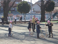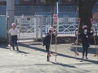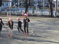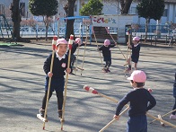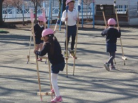 皆で一斉に竹馬のりをしました。練習しながら友達同士でどこまで乗れるかとか確かめたり、教え合ったりと互いに刺激をしながら、意欲をもって頑張ったいました。