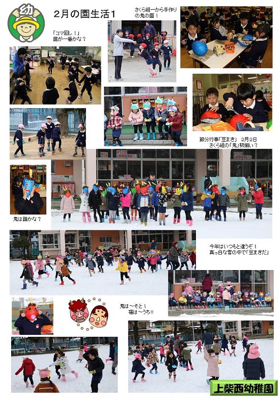 春休みを利用して3学期の園生活を写真で紹介しています。今回はその4回目(2月)です。(独楽回し・豆まき等)